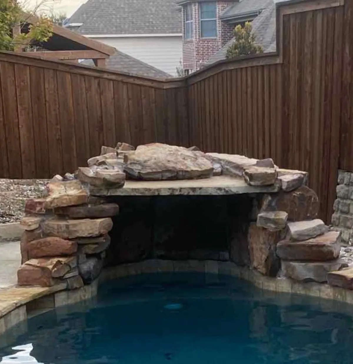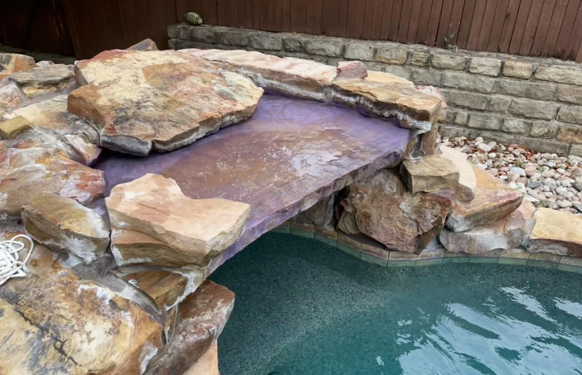 Removed purple stain that was the result of mismanaged pool chemistry resulting in high metal and cyanuric acid levels. Restored the natural stone and tile color.