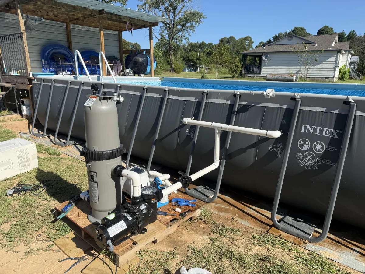 Retrofitted/upgraded equipment for an above-ground pool improving filtration and circulation.